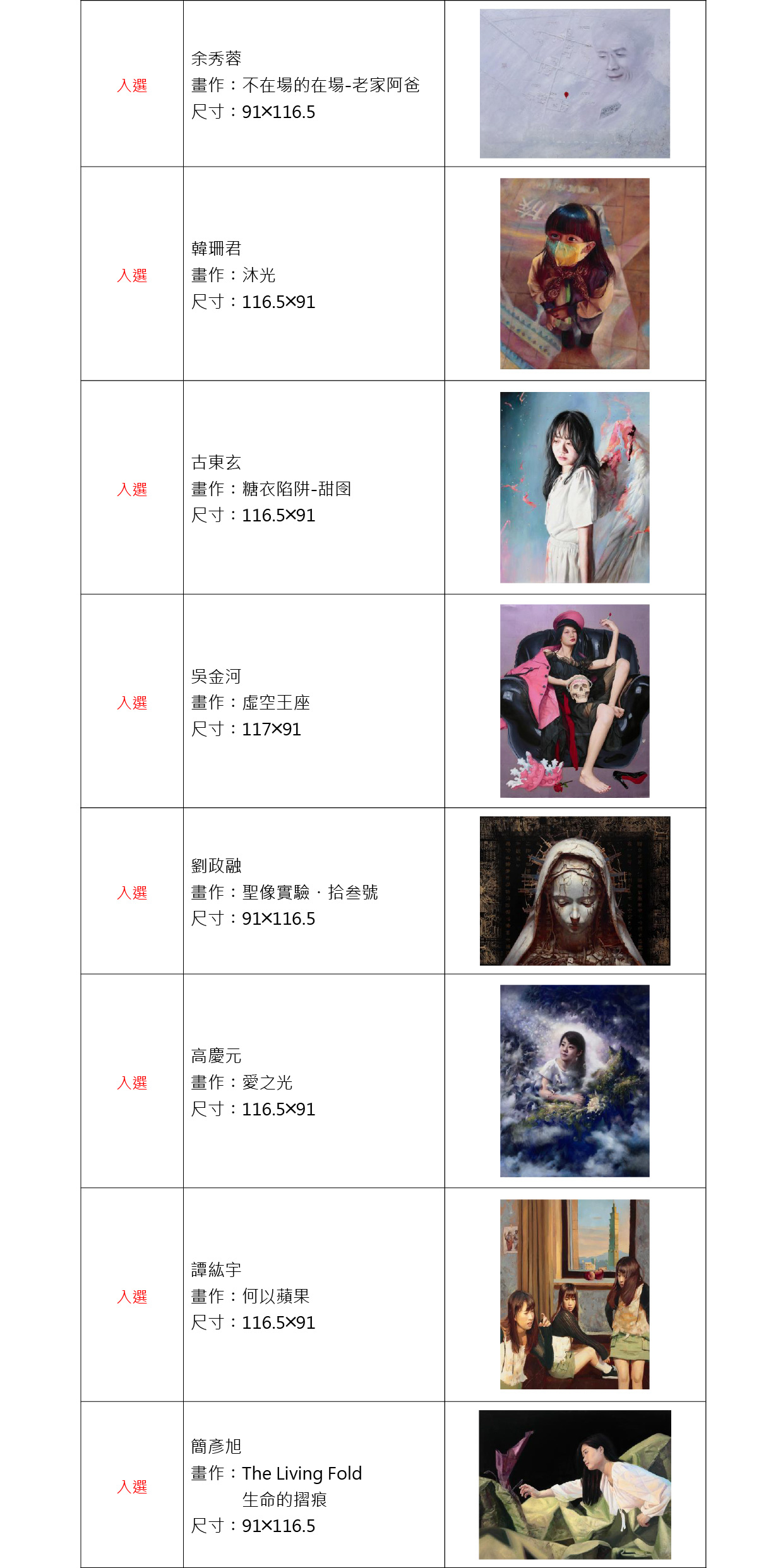 Hội đồng giám khảo do Giáo sư danh dự Su Xingfa của Khoa Mỹ thuật, Đại học Sư phạm Quốc gia Đài Loan làm chủ tịch, cùng với 4 thành viên giám khảo khác, bao gồm: Giám đốc Bảo tàng Mỹ thuật Quốc gia Đài Loan Chen Kuang-yi, Hiệu trưởng Khoa Nhân văn, Đại học Giáo dục Quốc gia Đài Trung Lin Chin-hsien, Phó giáo sư Khoa Mỹ thuật, Đại học Sư phạm Quốc gia Đài Loan Hou Chung-ying, Phó giáo sư Khoa Nghệ thuật Thị giác và Thiết kế, Đại học Quốc gia Đài Nam Hong Ming-chueh.